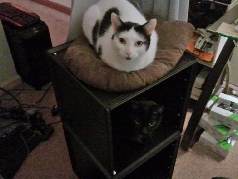 Ha! You thought our cats got along? Hoooo boy. They do not. The above picture captured a crazy deviation from the norm: the event most likely lasted well under ten seconds, after which Neko (above) would’ve begun relentlessly attempting to rid her little two story house of all traces of Gato. C’mon, cats, you’re sisters! At least pretend you love each other!
